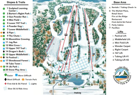 Powder Ridge: 20 Trails, 64.81Acres, 377ft Base, 815ft Top, 438ft Vertical